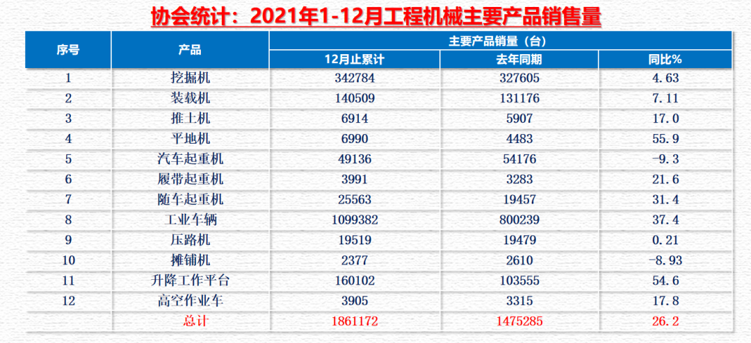 就納入?yún)f(xié)會(huì)統(tǒng)計(jì)的十二類產(chǎn)品數(shù)據(jù)顯示。2021年累計(jì)銷售產(chǎn)品1861172臺(tái),同比26.2%,其中挖掘機(jī)342784臺(tái),同比26.2%。
