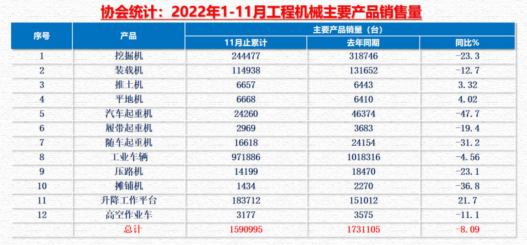 2022年1-11月,累計(jì)銷售1590995臺(tái),同比下降8.09%,其中挖掘機(jī)244477臺(tái),同比下降23.3%。