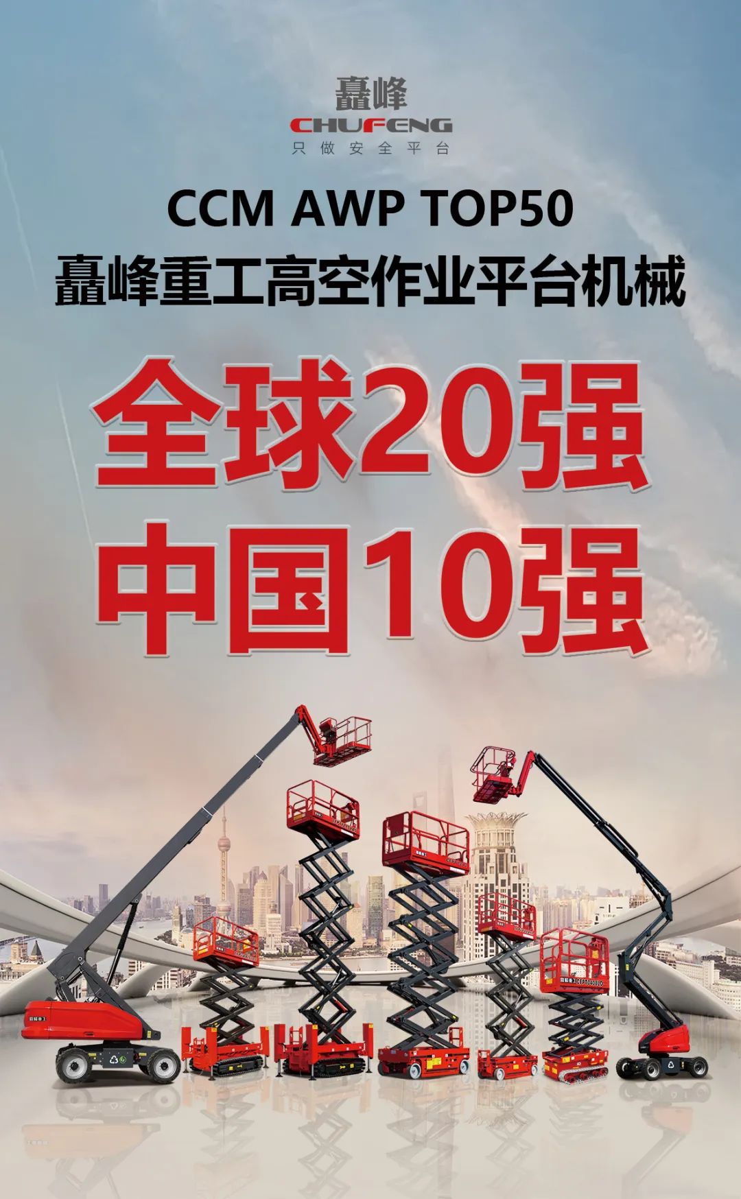 自2021年矗峰重工榮耀獲得中國高空作業(yè)機械制造商10強,連續(xù)三年榮獲“全球20強、中國10強”企業(yè)。矗峰重工將持續(xù)領(lǐng)跑市場,創(chuàng)新安全高效!
